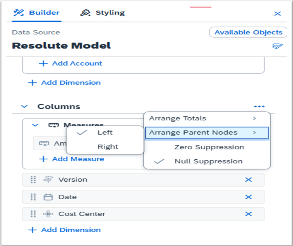 2. Expand the sections so you can clearly see Available Objects (dimensions, measures, accounts, versions).