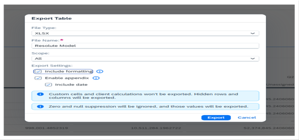 • In Story 2.0 + “View” mode, when you choose “Scope = All” for XLSX export, hierarchical data (e.g., from BW Live) may only export parent nodes, not the full structure.